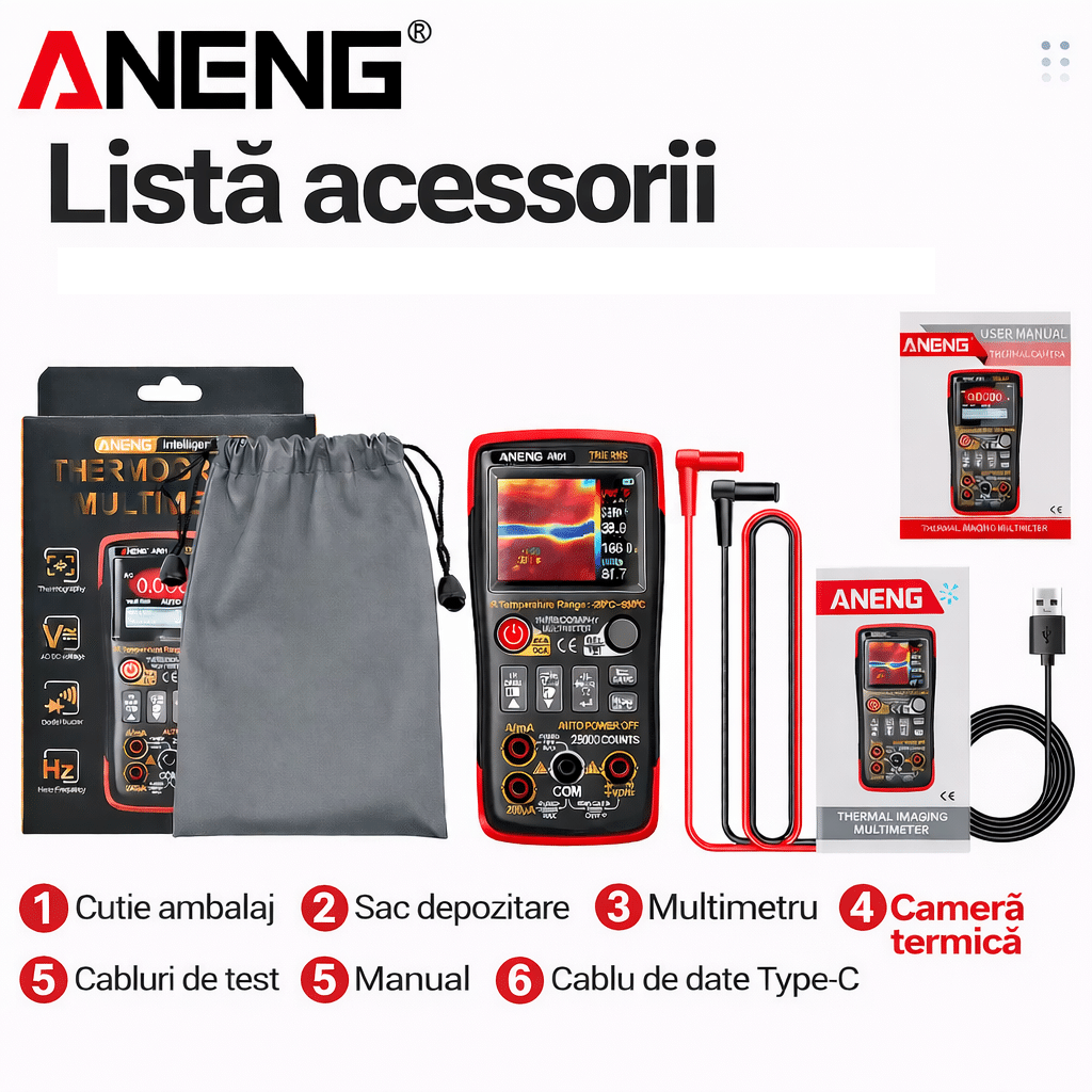 ANENG AR01 este un multimetru digital profesional cu cameră termică integrată, conceput pentru măsurători electrice avansate și diagnostic rapid în aplicații rezidențiale și industriale. Dispozitivul combină precizia unui multimetru 25000 counts cu avantajele termoviziunii, permițând identificarea rapidă a punctelor fierbinți, conexiunilor defecte și componentelor supraîncălzite.