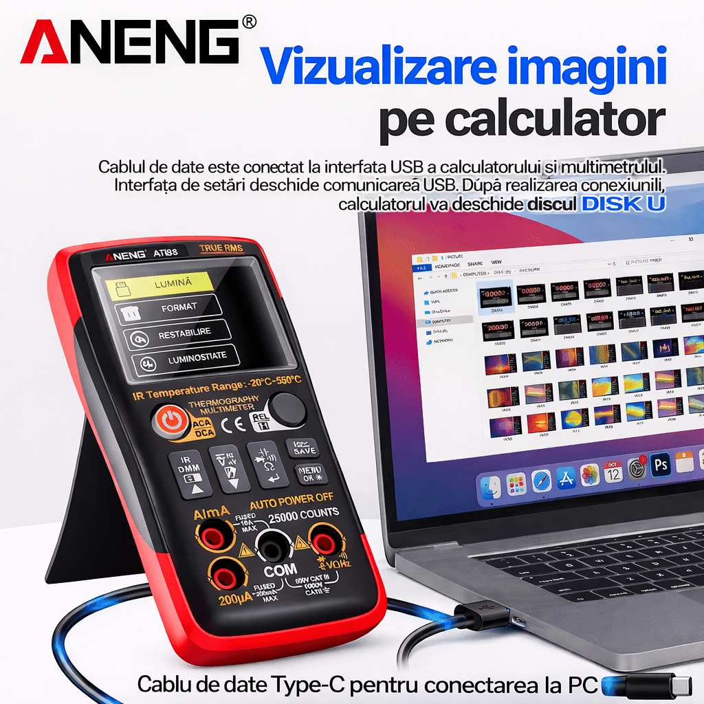 Afișajul TFT color oferă vizualizare clară a valorilor electrice și a imaginii termice în timp real. Indicatorul de baterie descărcată și alimentarea prin USB Type-C asigură autonomie și utilizare eficientă în teren.