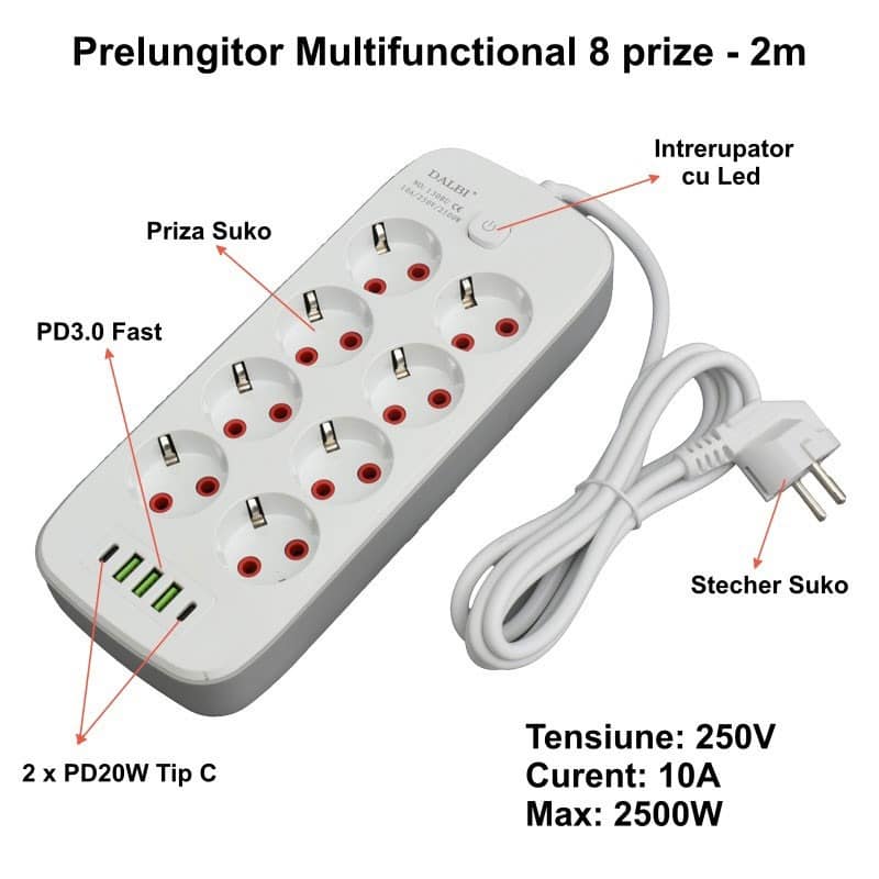 Prelungitorul multifuncțional cu 8 prize și porturi USB integrate este soluția ideală pentru alimentarea simultană a tuturor dispozitivelor tale, acasă sau la birou. Cu un cablu de 2 metri, încărcare rapidă prin USB PD și întrerupător general, îți oferă siguranță, flexibilitate și eficiență într-un singur produs compact.